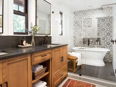 By Ashley Campbell Interior Design. Step into a realm of striking contrast in this ADA-compliant bathroom remodel, where light and dark elements harmonize in perfect balance. This wet room is...