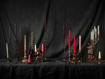 From left to right: HomArt jon brass candlestick, gold unscented tree candle, black HomArt clarke taper candleholder, Mackenzie-Childs dinner candles, black single hearth round taper holder, pink and...
