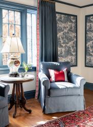 Curtains in the same blue as the trim continue the color story. They trimmed the edge of the curtains with red. “We needed some kind of accent to bring the red to that area of the room—to balance the red from the carpet,” she says.