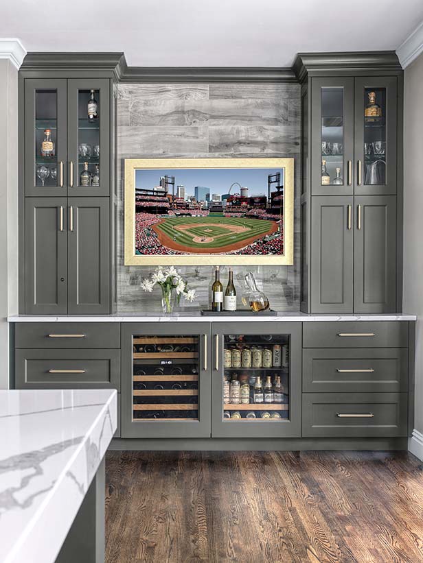 The designer says a gray faux-oak porcelain backsplash tile provides a linear element that balances the full-height wall towers, and a mirror-concealed television can be conveniently viewed from the island seating.