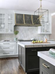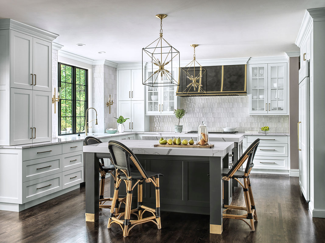“Warm brass elements are sprinkled throughout the kitchen, on the faucet, cabinet pulls, wall sconces, pendants and brass caps on the island posts,” Christine says.