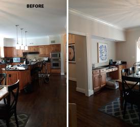 She adds that she also wanted to improve the function of the space for this family. So, within the area, Christine created a new, walk-in pantry behind the refrigerator, installed a butler’s pantry adjacent to the dining room and transformed a previously unused desk area into a walk-up bar. The same dark finish adds drama to the bar, complete with a wine cooler for 42 bottles, beverage center and lockable cabinet for valuable vintages.